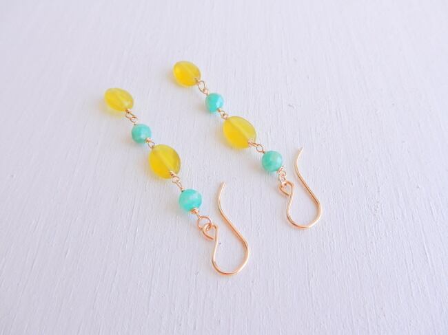 対象的な爽やかグリーンのアマゾナイトを合わせたロングピアスです。