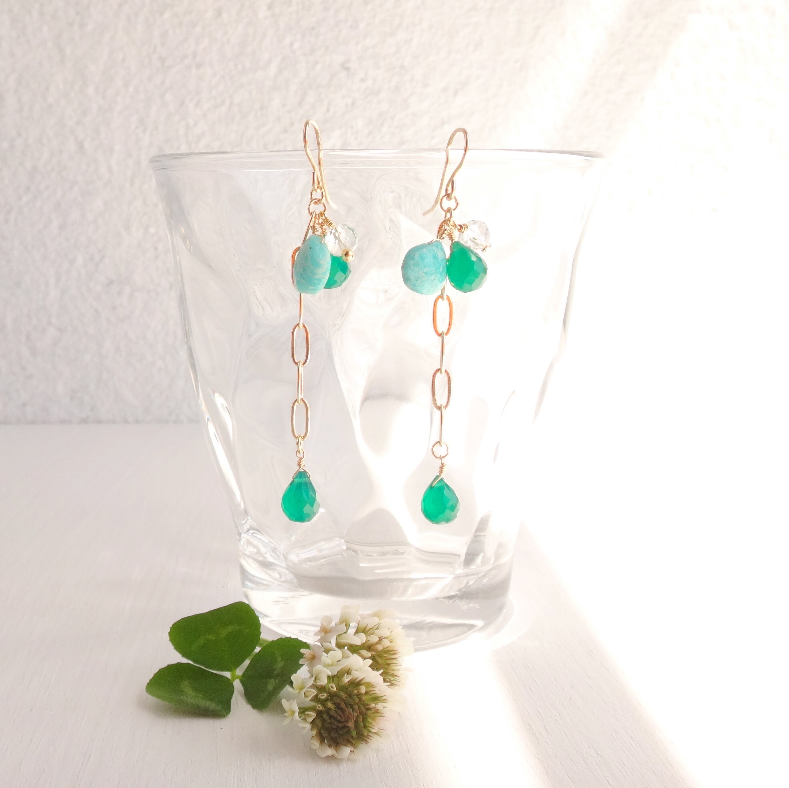2つのグリーンに一粒のクリスタルで透明感を添えて爽やかな4月の風をイメージしたピアスです。耳元でそよぐ春風をお楽しみください。